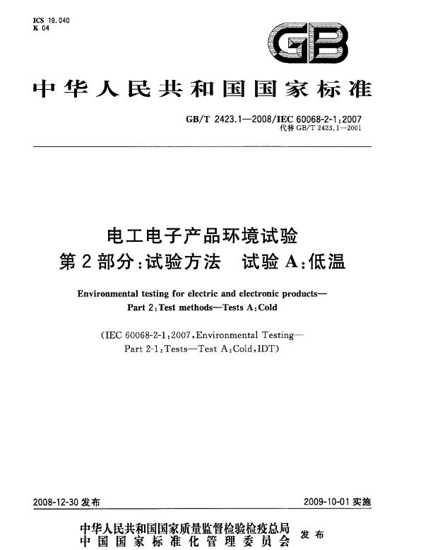 GB/T 2423.1-2008是中國國家標準,全稱為《電子和電氣產品環境試驗 第2部分:試驗方法 第1節:冷熱試驗》。該標準主要針對電子和電氣產品在溫度變化環境下進行測試的方法和要求。
